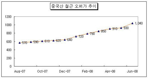 한 철근 수입업체 관계자는 “현재 베이징 올림픽과 관련해 건설공사가 중단되면서 중국 내수 물량에 여유가 있는 것은 사실”이라면서도 “그러나 수출 가격은 수출국의 내수 시장이 아니라 수입이 이뤄지는 시장 상황에 맞춰 결정된다”고 말해 수입 철근 오퍼 가격의 급등 가능성을 언급했다.