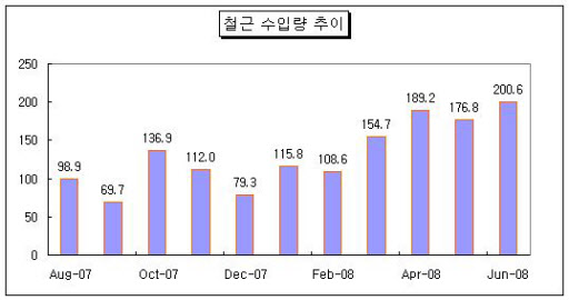 수입 철근 역시 변수로 작용하고 있다. 우리나라 철근 수입량은 올해 들어 매월 10만톤을 넘어서고 있으며 3월부터 큰 폭으로 늘어나기 시작했다. 당초 15만톤 수준에 그칠 것으로 예상됐던 5월 철근 수입량도 17만톤을 돌파했으며 6월 철근 수입량은 20만톤이 넘는 것으로 알려졌다.