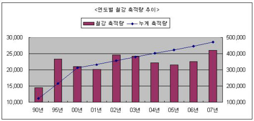 이에 따라 2007년말 기준 철강 누계축적량은 4억7,278만톤으로 최근과 같은 연평균 5.6%대의 축적량 증가 추세가 지속 될 경우 2007년말 77% 수준인 철스크랩 자급시기는 2007년 5월 산업연구원이 2005년이후 연평균 3.2% 수준의 증가를 전제로 전망한 2022년경 보다 다소 앞당겨 질것으로 예상된다.