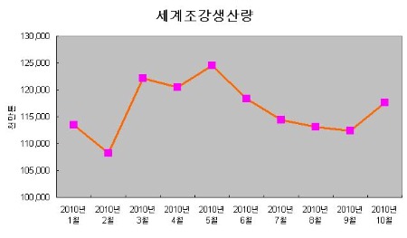 세계철강협회(WSA)에 의하면 66개국 총 세계 조강생산량은 10월 들어 늘어난 모습을 나타내고 있다. 지난 6월 이후 조금씩 감소했던 조강생산량이 10월 들어 증가하면서 9월 대비 2.8% 늘어났다.