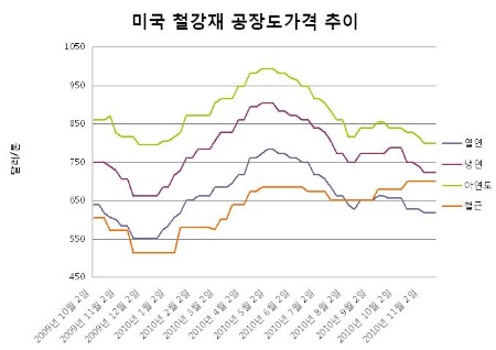 종합상사 관계자는 “미국의 주요 철강사들이 12월 이후 철강가격을 인상시키려 노력은 하고 있지만 쉽지는 않은 상황”이라며 “개인적으로는 연말까지 약보합세를 유지할 것으로 예측된다”고 말했다.