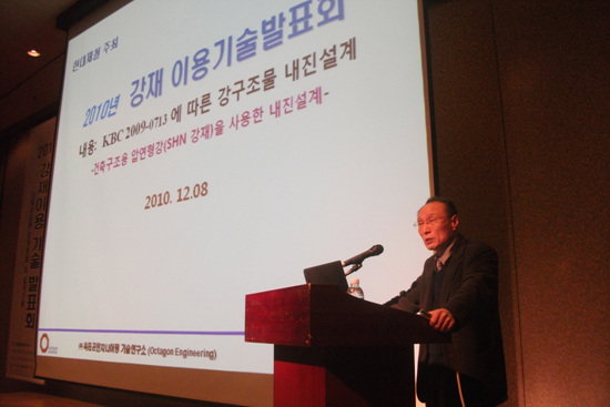 8일 현대제철이 삼성역 COEX 그랜드볼룸에서 개최한 '2010 강재이용 기술 발표회'에서 옥타곤엔지니어링 박대영 기술연구소장은 '건축구조용 강재(건축구조용 열간압연 H형강-SHN 400, SHN 490)와 내진설계 기술' 발표를 통해 일반 강재와는 다른 건축구조용 강재의 특이점과 이를 활용한 다양한 내진설계 기술에 대해 설명했다.