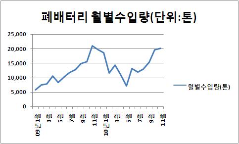 이로써 국내 폐배터리 월별 수입량은 8월(1만3,030톤)과 9월(1만5,455톤) 그리고 10월(1만9,804톤)에 이어 연속 4개월째 오름세를 보였다.