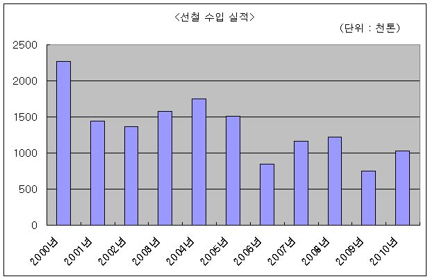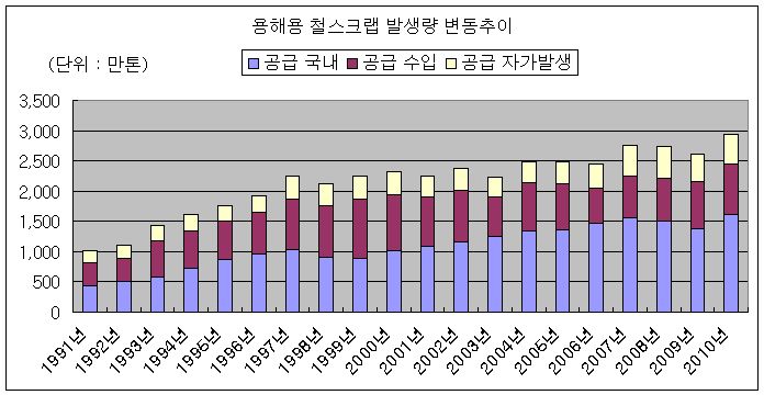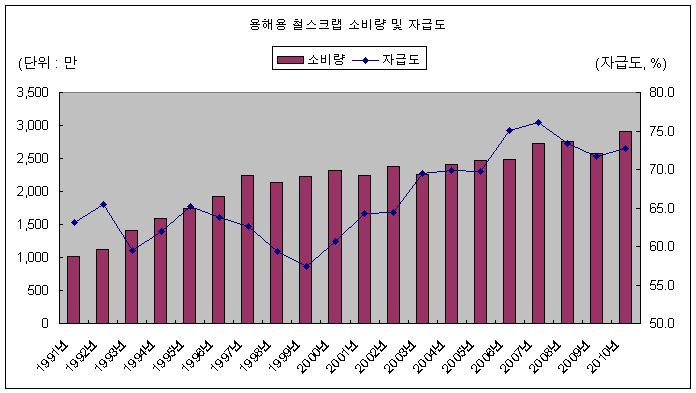 철스크랩 수입이 800만톤을 넘은 점도 주목을 받고 있다. 20년전인 1991년 국내 철스크랩 수입 규모는 375만톤 수준에 그쳤으나 이후 급격히 증가하면서 1999년에는 976만톤 수준으로 최고를 기록하기도 했다. 2006년에는 다시 578만톤 수준으로 감소했다가 이후 꾸준히 증가하면서 2010년에는 821만톤 수준을 기록하게 됐다.