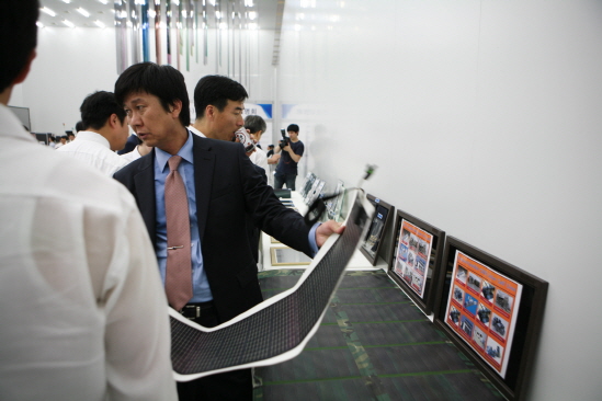 ▲ 대양금속 하정모 부회장이 참석한 내빈들에게 CIGS 박막형 태양전지 제품을 설명하고 있다.