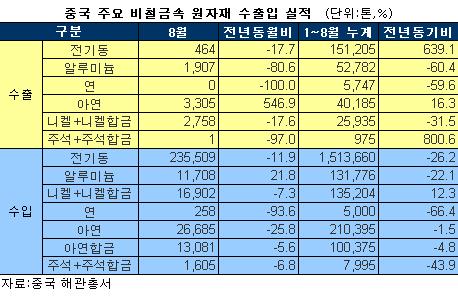 8월, Zn수출·Al수입 外 모두 감소
