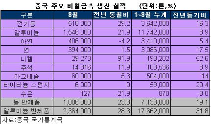 같은 달 중국 내 주요 비철금속 생산은 아연(-4.2%)과 수은(-21.9%)을 제외한 니켈(91.9%)과 전기동(29.2%), 알루미늄(21.9%) 등 대부분 전년 동월 대비 증가세를 지속했다. 알루미늄과 동 반제품 생산 역시 각각 28.3%, 23.3%의 증가율로 견조함을 유지했다.