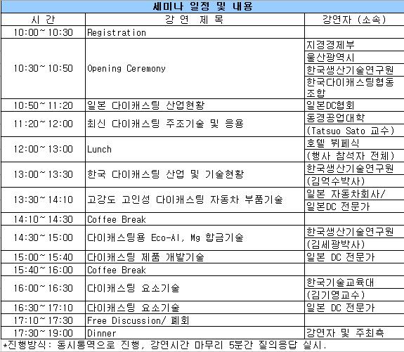 주된 내용으로는 ▲일본 다이캐스팅 산업현황 ▲최신 다이캐스팅 주조기술 및 응용 ▲한국 다이캐스팅 산업 및 기술현황 ▲다이캐스팅용 Eco-Al, Mg 합금기술 등 총 8개의 주제발표가 예정돼 있다.