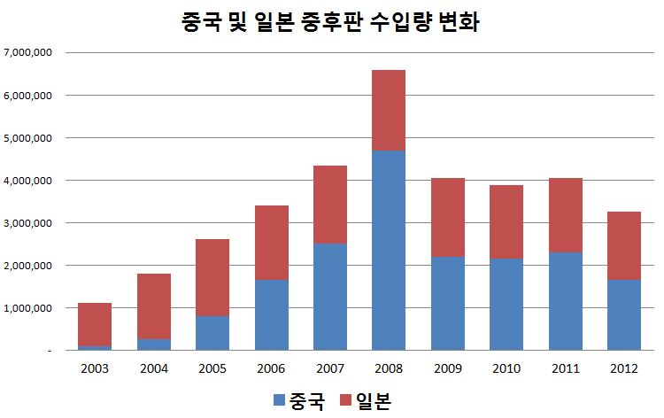 국내에서는 수입량이 너무 높다는 점을 인식, 지난 2011년부터 후판 수입대응에 최선을 다하고 있다. 지난 2011년 말부터 수입대응을 시작해 그 효과를 보고 있다. 올해도 수입대응이 지속적으로 이뤄지고 있기 때문에 시중에서는 수입재가 300만톤에 못 미치는 양을 기록할 것으로 기대하고 있다.