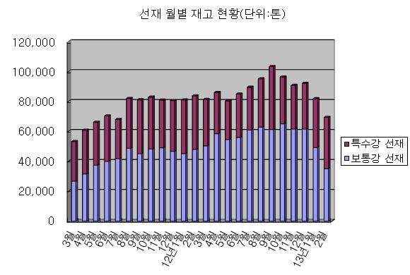 이는 올 1월보다 선재 생산량이 3만4,000톤 가량 감소하는 등 포스코가 선재 생산량 조절에 들어갔던 영향이 컸으며 특수강 선재의 경우 주 수요처인 자동차 산업이 내수에서 다소 탄력을 받지 못하면서 재고량이 증가했던 원인으로 풀이된다.