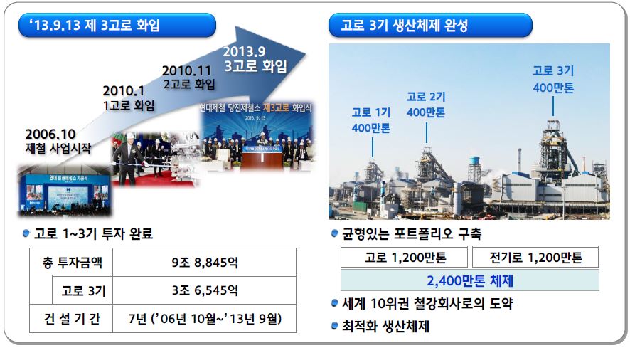 현대제철은 지난 2010년 1월 1고로 화입, 11월에 2고로 화입, 올 9월에 3고로를 화입했다. 이에 따라 1,200만톤 생산체제를 구축했으며 균형있는 포트폴리오 구축, 세계 10위권 철강회사로의 도약, 최적화 생산체제를 이뤘다.