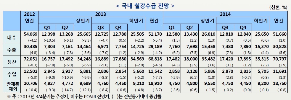 이와 함께 POSRI는 2014년에 자동차가 소폭 회복되겠지만 조선과 건설의 부진이 지속될 것으로 내다봤다.