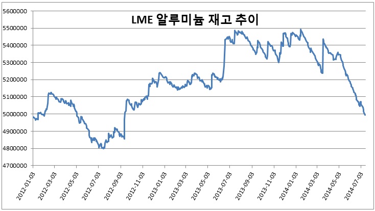 한편, LME 창고 알루미늄 재고는 14일 현재 499만5,275톤을 기록하면서 2012년 9월 이후 1년 10개월 만에 500만톤 아래로 내려왔다. 전반적인 감소세 속에 7월 평균 재고 역시 503만5,113톤 수준으로 6월 평균 재고 대비 8만2,467톤 규모의 감소세를 기록 중이다.