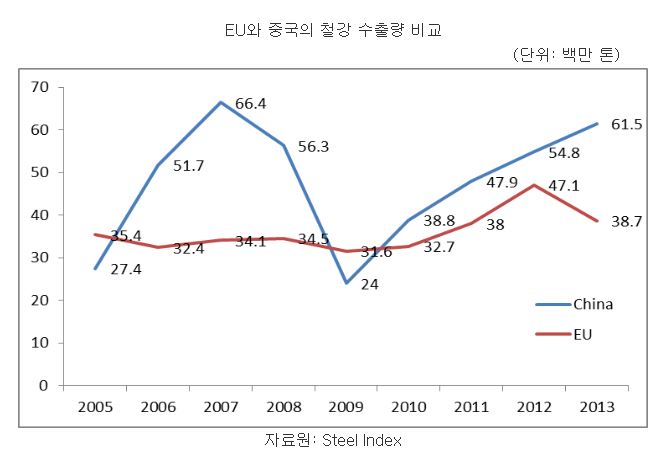 유럽철강협회(EUROFER)에 따르면 2013년도 EU 철강재 수입은 1,580만톤으로 전년대비 14% 증가했다. 2014년 수입은 약 22% 증가한 1,950만톤으로 추정되는데 그 중 절반 이상은 중국산이 차지하고 있다.