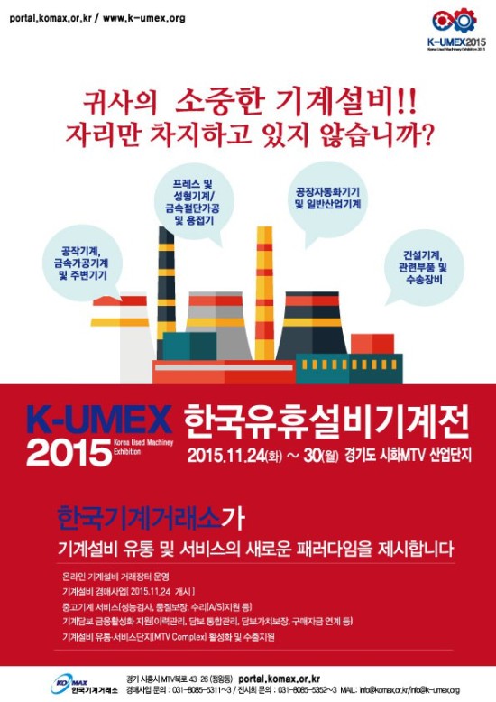 ‘K-UMEX 2015’에 대한 보다 자세한 사항은 공식 홈페이지(www.k-umex.org)와 한국기계거래소(portal.komax.or.kr)에서 확인할 수 있다.