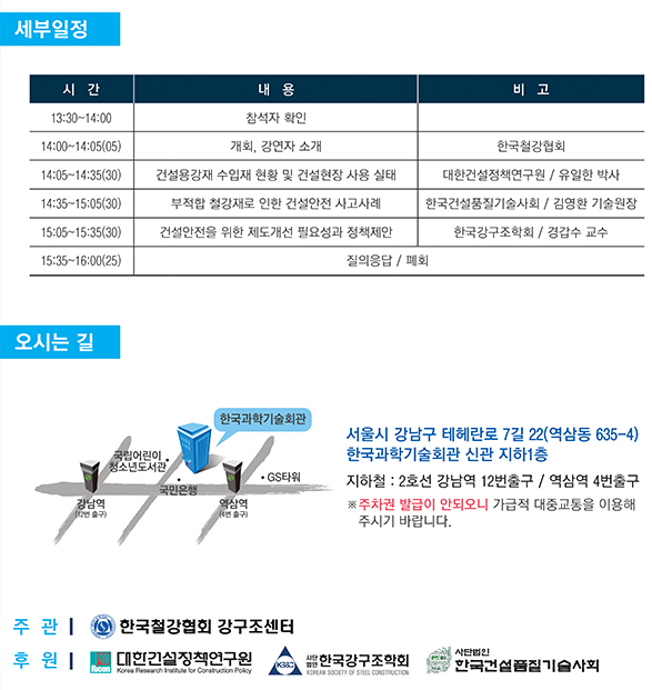 대한건설정책연구원 유일한 박사가 '건설용강재 수입재 현황 및 건설현장 사용 실태'를 주체로 발표에 나서며 한국건설품질기술사회 김영환 기술원장이 '부적합 철강재로 인한 건설안전 사고사례'를 발표할 예정이다. 이어 한국강구조학회 경갑수 교수는 '건설안전을 위한 제도개선 필요성과 정책제안'을 주제로 발표한다.