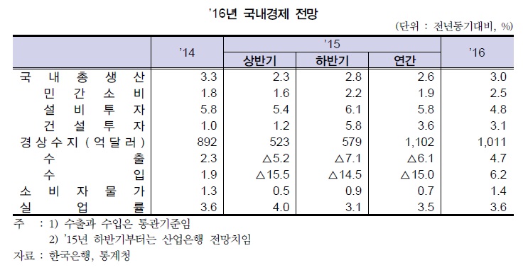 산업은행이 2016년 우리 경제가 3% 성장할 것으로 전망했다. 산업은행은 23일 '2016년 경제·금융·산업 전망' 보고서를 통해 이처럼 밝혔다.
