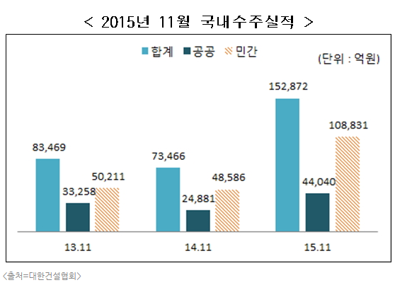대한건설협회는 2015년 11월 국내 건설공사 수주액이 15조2,872억원으로 전년 동기 대비 108.1% 증가했다고 8일 밝혔다. 전월 대비로는 27.4% 늘었다.