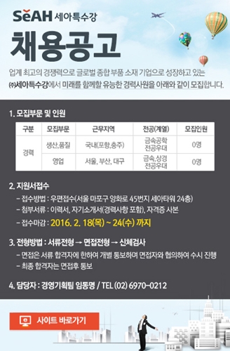 모집부문은 생산·품질/영업 부문으로 금속공학 전공자를 우대한다. 근무지역은 서울, 부산, 대구, 포항, 충주 등이다.
