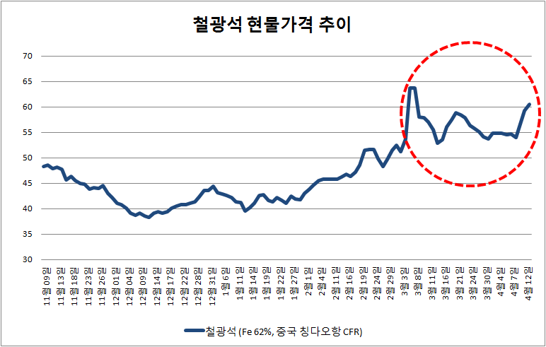 이번 주 들어 철광석 현물가격은 뚜렷한 강세를 보이고 있다. 지난 8일 가격에 비해서 사흘동안 6.45달러가 올랐는데, 상승률은 11.9%에 이른다.