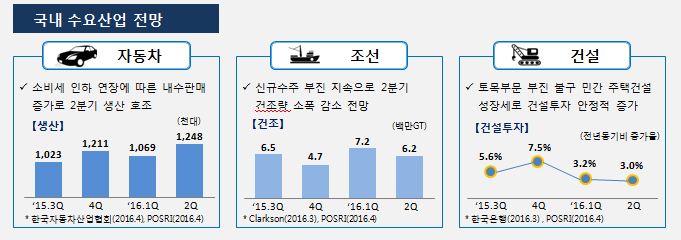 2분기 국내 수요산업 중 조선을 제외한 자동차와 건설 산업이 호조를 보일 것으로 예상된다.