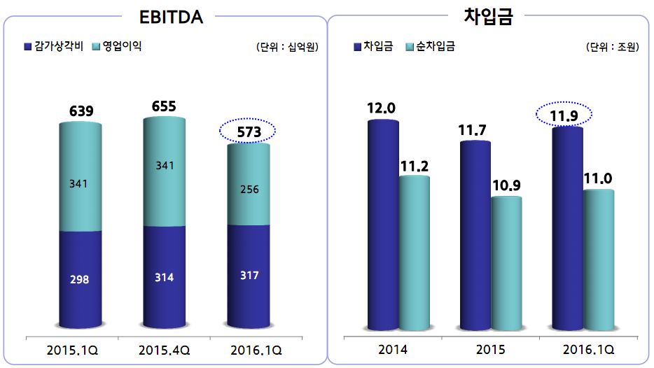 공시 자료에 따르면 올해 1분기 감가상각비는 3,170억원 영업익은 2,560억원으로 총 EBITDA(상각 전 영업이익) 5,730억원을 기록했다. 이는 지난해 같은 기간 6,390억원 보다 66억원 하락한 수치다.
