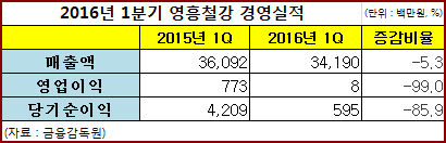 영흥철강(대표 김익중)은 올해 1분기 영업이익이 800만원으로 전년 동기 대비 99% 감소했다고 16일 밝혔다.