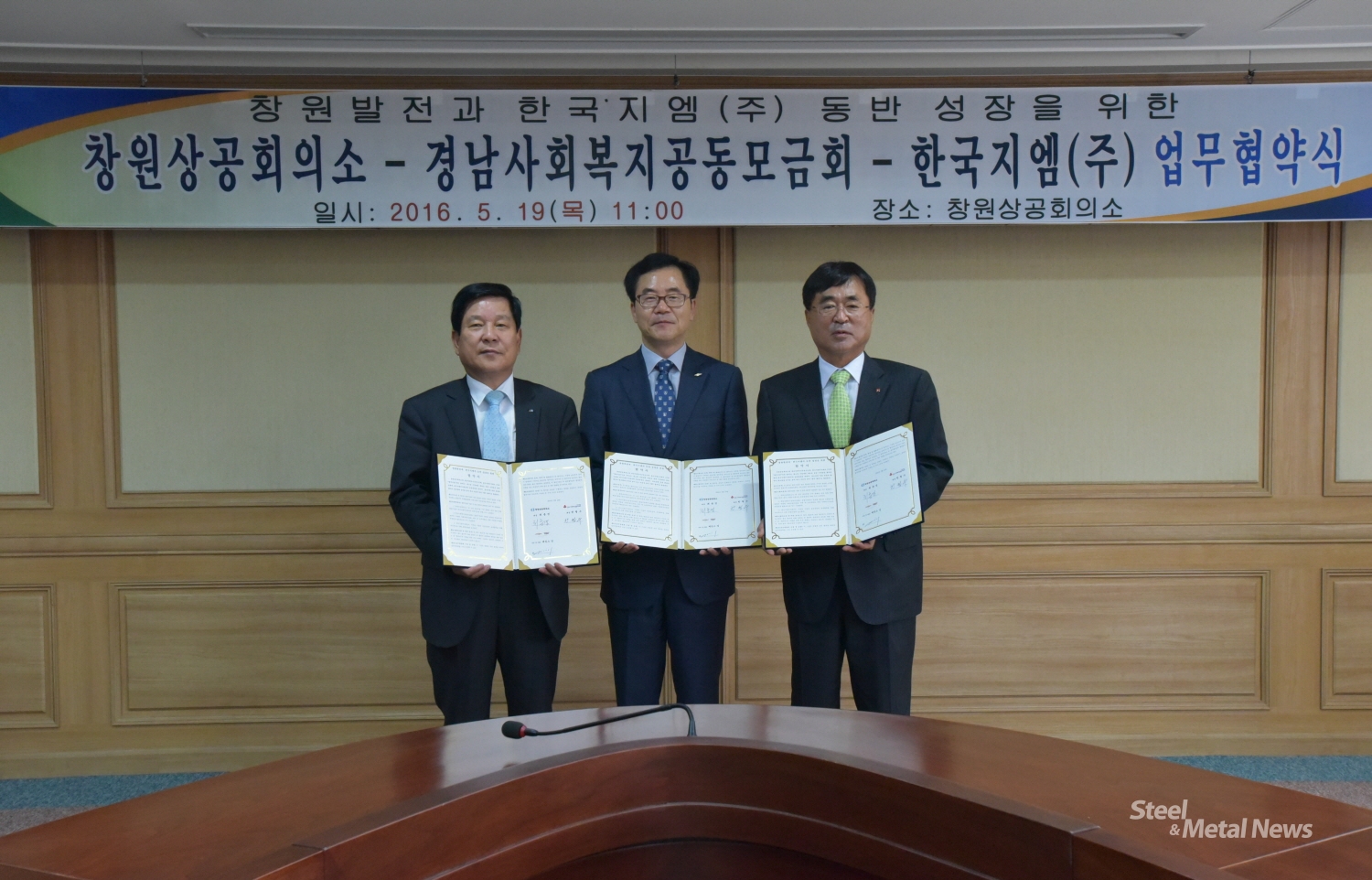 창원상공회의소 회장을 겸하고 있는 경남스틸의 최충경 회장이 한국GM 창원공장, 경남사회복지공동모금회와 '창원 발전과 한국GM 동반성장을 위한 업무협약'을 체결했다.