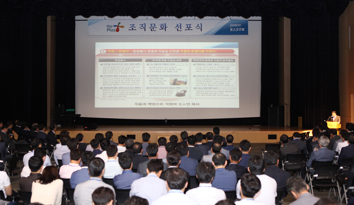 포스코건설은 15일 오전 인천 송도 포스코건설 사옥에서 임직원 250여명이 참석한 가운데 회사의 비전을 달성하고 업무 환경을 개선하기 위한 ‘the Plus(더 플러스) 운동’을 실시하겠다고 선포했다.
