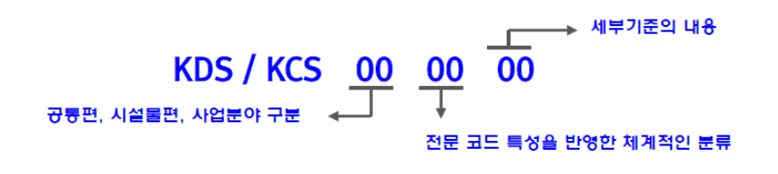 코드체계는 설계기준(KDS)과 시공기준(KCS)으로 구분되며 공종별 세부내용에 따른 6자리의 숫자로 정해진다.