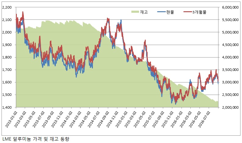 LME 알루미늄 가격은 세계금속통계국(WBMS, World Bureau of Metal Statistics)의 알루미늄 공급 부족 발표에 지난 8월 18일 현물이 톤당 1,690.5달러, 3개월물이 톤당 1,700.5달러로 모두 지난해 7월 이후 1년래 최고 가격을 경신했다.