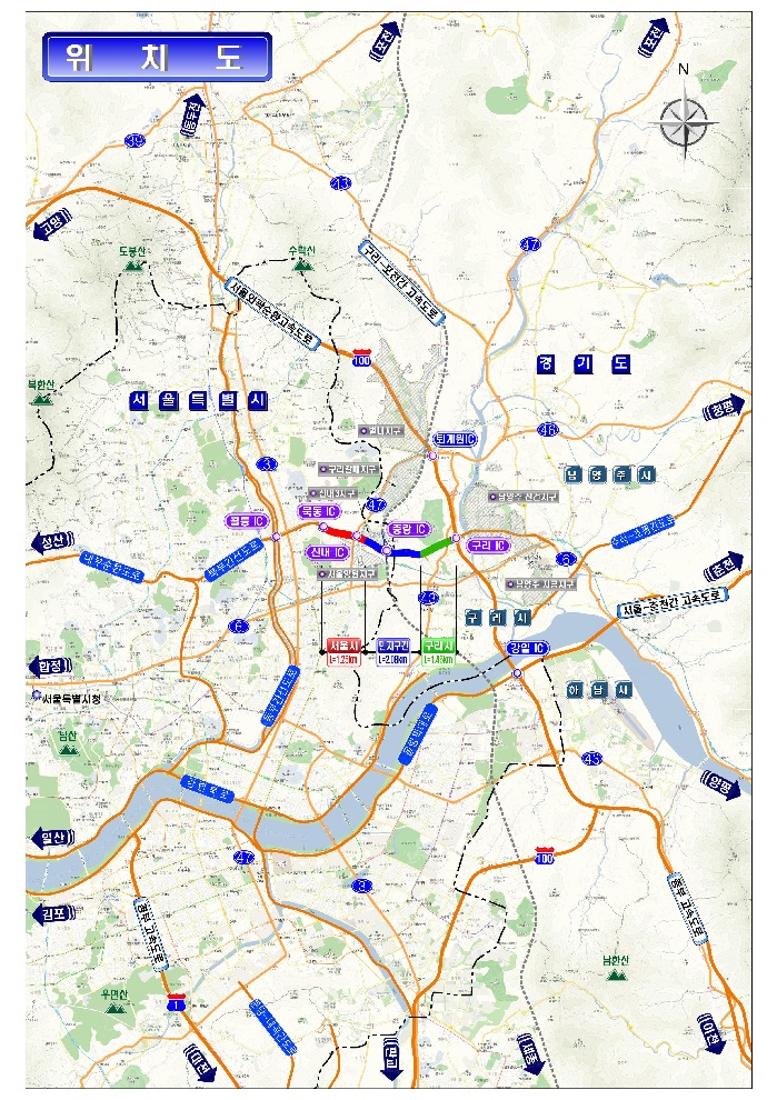 북부간선도로의 구간별 확장방안을 살펴보면 서울시 구간 1.25km는 북부간선도로의 양측으로 1차로씩 확장하고, 구리시 구간 1.45km는 기존의 도로폭 조정 등을 통해 본선 6차로를 확보할 계획이다.