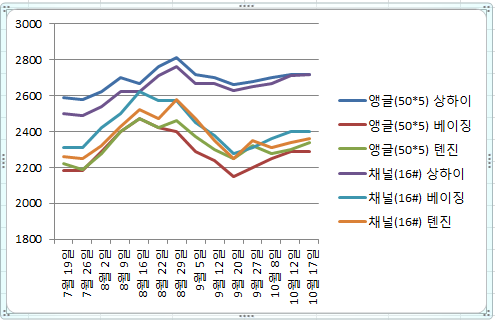 지난 9월 20일 즈음부터 중국 주요 도시의 ㄱ형강(앵글, 50*5), ㄷ형강(채널, 16#) 가격이 우상향 곡선을 나타내고 있다.