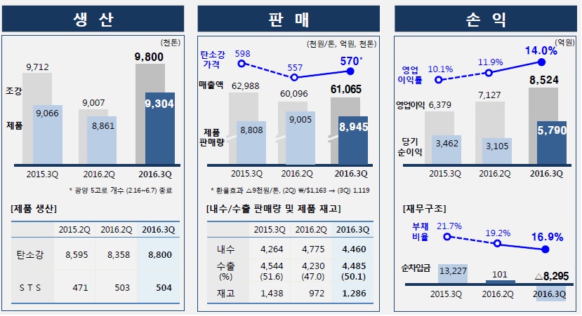 포스코의 별도기준 3분기 매출액은 6조1,065억원, 영업이익은 8,524억원, 당기순이익은 5,790억원을 기록했다. 영업이익률은 14%를 기록해 지난 2분기보다 2.1%포인트 상승했으다.