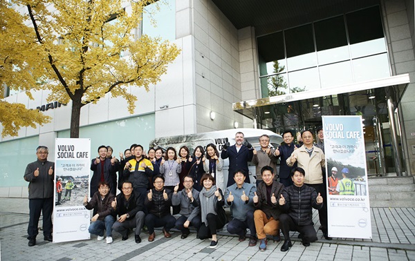 볼보건설기계코리아 임직원들이 한남동 본사에서 ‘찾아가는 소셜카페’의시작을 알리며 단체사진을 촬영하고 있다.