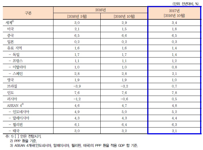한편, KIEP는 세계 경제는 ▲브렉시트의 정치적 불확실성에 따른 투자 및 소비 침체 ▲미국 차기 정부의 보호주의적 통상 정책 및 확장적 재정 정책에 따른 급격한 금리 상승 ▲중국 부동산 경기의 급락과 내수 위축 ▲낮은 자원 가격 지속에 따른 자원부국 경기 회복세 지연 등 하방 리스크 요인을 안고 있다고 덧붙였다.