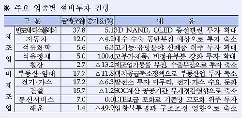 업종별로 투자계획을 살펴봐도 제조업이 90조7,000억원으로 4.0% 증가를 예상했으나 비제조업은 89조원으로 3.5% 감소를 전망했다.