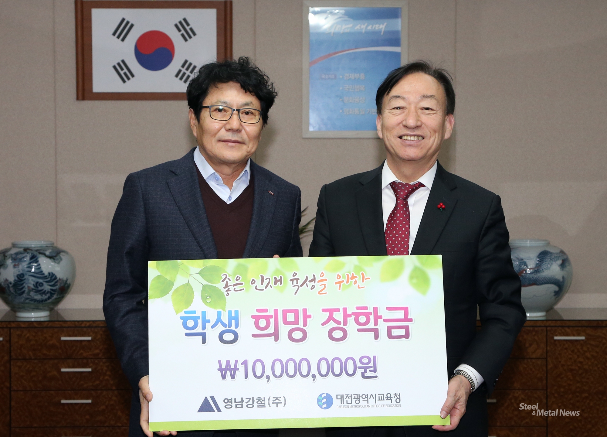 금속가구업체인 영남강철(대표 최성대)이 14일 대전교육청에 장학금 1,000만원을 전달했다.