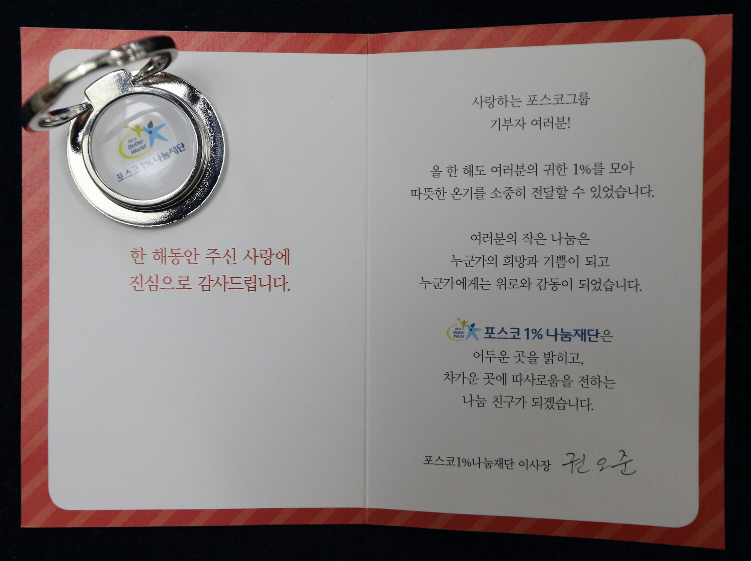 카드에는 올해 기부자들의 1% 작은 나눔이 우리사회의 온기가 필요한 곳에 희망과 기쁨, 위로와 감동이 되었다는 내용과 그에 대한 권오준 회장의 감사인사를 담았다.