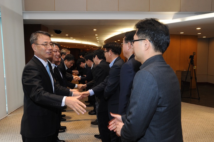 ▲ 취임식을 마친 후 오인환 사장이 임직원들과 인사를 나누는 모습.