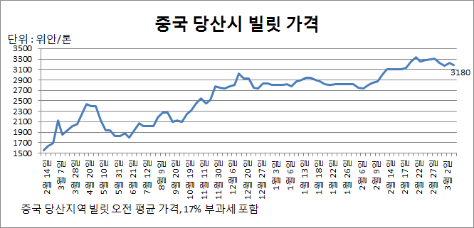 외신에 따르면 중국 내수 빌릿 가격은 지난 2월 말 톤당 3,300위안 수준을 유지하다가 지난 3월 1일부터 꺾이기 시작해 톤당 6일 3,180위안까지 떨어졌다.