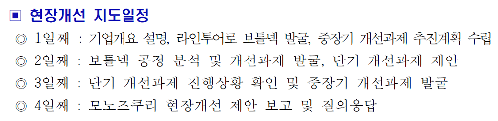 지도위원들은 선정된 12개 제조 중소·중견기업들을 다음 달 10일(월)에서 5월 12일(금) 사이 기업별로 4일씩 방문해 제품 개발, 원자재 구매, 생산, 판매 등 전 프로세스를 분석하고 품질·비용·납기 관리를 분석해 구체적인 개선안을 제안할 방침이다.