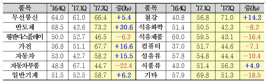 품목별로는 철강을 포함, 1분기 수출 호조를 이끌었던 반도체(73.2, 전분기대비 30.6p 상승)가 2분기에도 수출 회복을 주도할 전망이다. 무선통신기기의 경우 신제품 출시 효과로 지난 분기에 이어 기준치를 상회하고 있으며, 이 외에도 일반기계, 자동차, 식품류 등이 수출을 견인할 것으로 전망된다. 한편 최근 원유 가격 상승세가 약화되면서 석유제품 및 석유화학의 수출 환경은 다소 어려워질 것으로 예상된다.