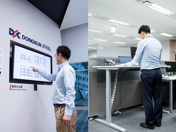선 채로 일하는 ‘스탠딩 워크(Standing Work)’를 시행 중인 동국제강이 직원들의 건강·효율 두 마리 토끼를 잡고 있다.
