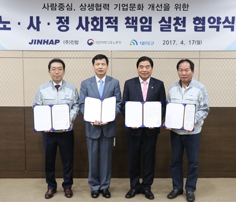 파스너 전문 생산업체 진합(대표 이원준)은 대전지방고용노동청, 대덕구와 17일 진합 대덕공장서 노사정 사회적책임 실천 협약을 체결했다.