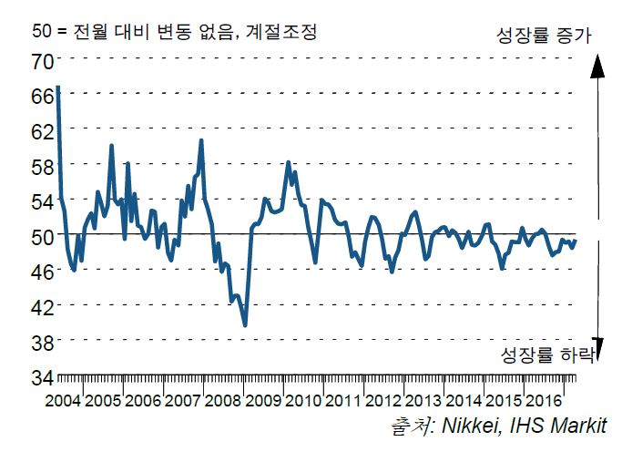 니케이(Nikkei)와 마킷(Markit)이 공동으로 조사한 4월 한국 제조업 PMI(Purchasing Managers´Index)는 3월의 48.4에서 상승한 49.4로 올해 최고치를 기록했다. 단, 4월에도 기준선인 50.0을 하회하면서 9개월 연속된 경기 약세를 시사했다.