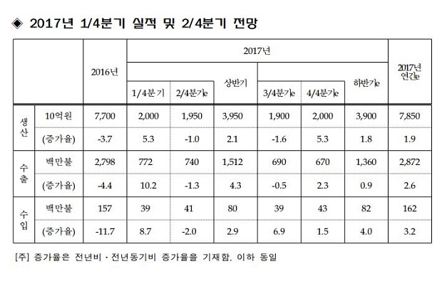 국내 금형산업이 주력산업 경기 회복과 전년 대비 기저효과로 인해 1분기 실적이 개선되었지만 경기 침체 장기화에 따른 생산 감소가 우려된다. 게다가 중국의 사드문제 장기화와 미국의 보호무역주의 강화, 멕시코의 불확실성 확대 등에 따른 수출 감소 우려까지 제기되면서 2분기 실적은 전년보다 악화될 것이라는 전망이 나오고 있다.