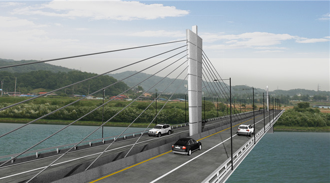 교량은 하중을 받는 다리를 수평으로 만들어 하중을 분산시킨 형태량 내 탑으로부터 비스듬히 내려 드리운 케이블로 주형을 매단 형태로 건설된다.