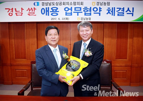▲ 경남스틸 최충경 회장(왼쪽)이 경남 쌀 애용 업무협약식에 참석했다.