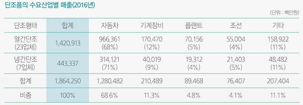 단조조합이 발표한 ‘단조업체 경영실적 분석보고서’에 따르면, 우선 형단조 분야는 한국산 자동차의 위축 등 어려운 시장여건 속에서도 리딩 기업을 중심으로 설비자동화, 품목다변화, 고정도 난형상 단조공정 개선 및 기술개발 등을 이어갔다.
